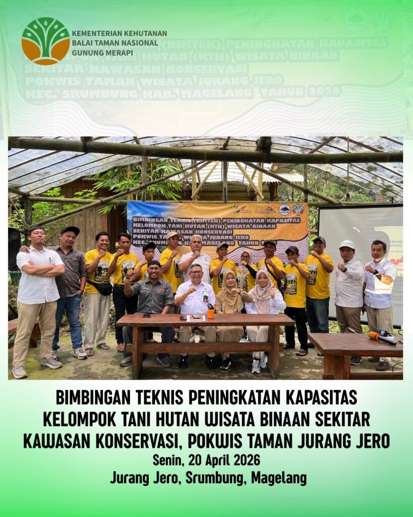Balai Taman Nasional Gunung Merapi menyelenggarakan kegiatan Bimbingan Teknis Peningkatan Kapasitas Kelompok Tani Hutan Wisata Binaan di kawasan OWA Jurang Jero, Desa Tegalrandu, Kecamatan Srumbung, Kabupaten Magelang pada 20 April 2026.